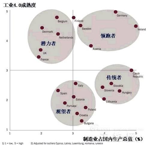 工业4.0成熟度衡量指标根据这种指标,欧盟主要制造可根据其对于工业4.0成熟度和制造业占总产值程度被划分为四类:领跑者(Frontrunners):德国,瑞典,奥地利,爱尔兰;潜力者(Potentialists):芬兰,比利时,丹麦,荷兰,英国,法国;传统者(Traditionalists):捷克,斯洛伐克,波兰,保加利亚,意大利等;观望者(Hesitators):西班牙,葡萄牙。