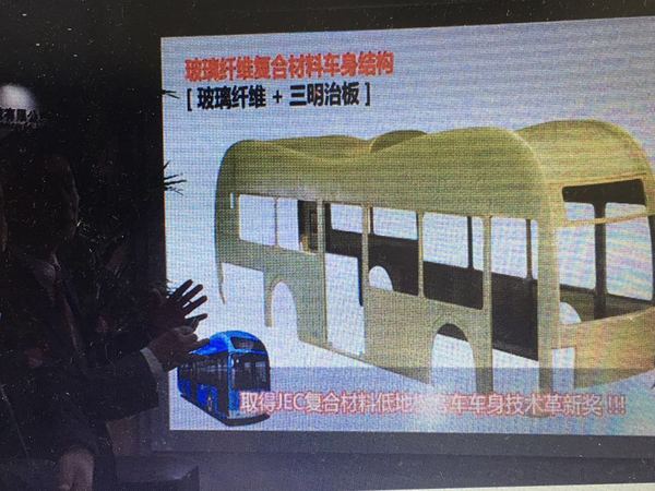 这是一种新型的高强度碳纤维复合材料车身,不仅具有轻量化,更具有高强度。这是山东泰汽电动车辆(集团)有限公司与韩国TGM公司展出的新款全新碳纤维结构电动客车。