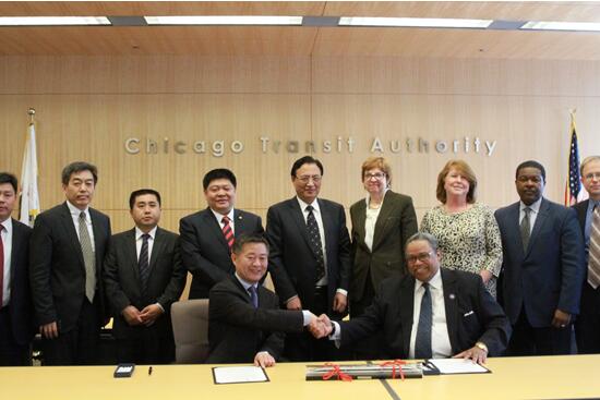 美国当地时间4月15日,中车与芝加哥交通管理局(CTA)在芝加哥举行会谈,中车四方股份公司总经理马云双与CTA总裁多尔瓦.卡特先生就CTA7000系地铁项目签字。中车董事长崔殿国、副总裁余卫平见证了签字仪式。