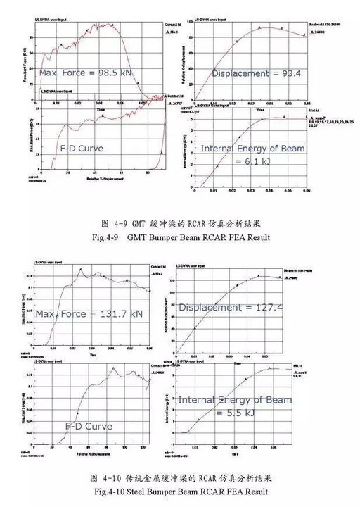 Max.Force和Displacement的意思,分别代表着“仿真防撞梁的大应力”,以及“大应变”,当然数值越小,就意味着性能越好。从测试结果中,就能看出GMT材质在这两项数值中优于传统金属防撞梁。