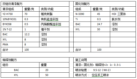 素材处理→2702MPP底油→70-75度/1小时→喷1K底色漆(推荐配方如注②)(10-15微米)→70度/15分钟→罩光清漆(推荐配方如注③)(30-40微米)→80度/1小时测试附着力,(80度加烘4小时后,做沸水煮及40度泡水10天测试)