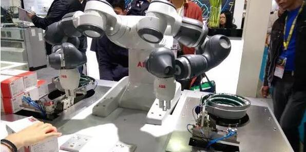 橡塑展的智能制造专区中有不少机器人展示,看惯了灵巧的单臂机器人,记者感觉ABB公司展示的双臂机器人不简单。只见机器人左右臂同时开工,左爪准确地从料盘里取出一小件,同时右爪也从右料盘里取出另一形状不同的料件;接着左右臂爪同时行动,左爪对小件进行再固定,右爪抓起旁边料件放在目标上,就像一个熟练的操作工在完成作业。难的是左右臂协调,就像一个人的左右臂和手同时动作。经过改型,其完全能够取代一些简单重复的汽车零部件流水线人工。记者在上海同期举办的另一个展会上也看到这台机器人在演示装配苹果手机的个性外壳。