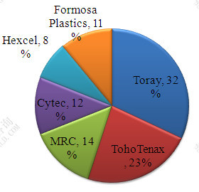 日本东丽(Toray)、日本东邦特耐克丝(TohoTenax)、日本三菱丽阳(Mitsubishi Rayon)、美国赫氏(Hexcel)、美国BP Amoco、台湾塑胶工业(Formosa Plastics)、美国福塔菲尔(Fortafil)(2004年被东邦收购)、美国阿尔迪拉(Aldila)(2013年被三菱丽阳收购)、德国爱斯奇爱尔(SGL)、美国卓尔泰克(Zoltek)(2013年被东丽收购)、美国氰特(Cytec)、韩国晓星(Hyosung)