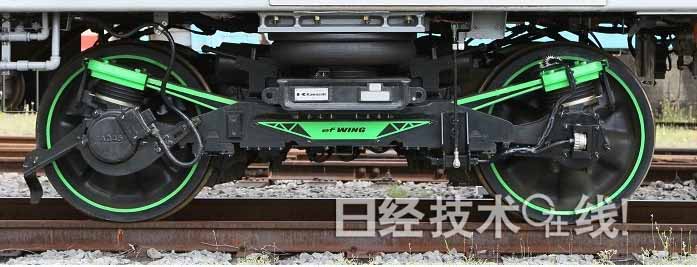 新型转向架将部分框架的材料从钢换成了CFRP。此外,原来的转向架利用与钢制侧梁分离独立的螺旋弹簧发挥悬挂作用,而新转向架则将侧梁与螺旋弹簧的功能整合到了弓形CFRP弹簧中。这样可大幅轻减转向架的重量,降低能源成本。