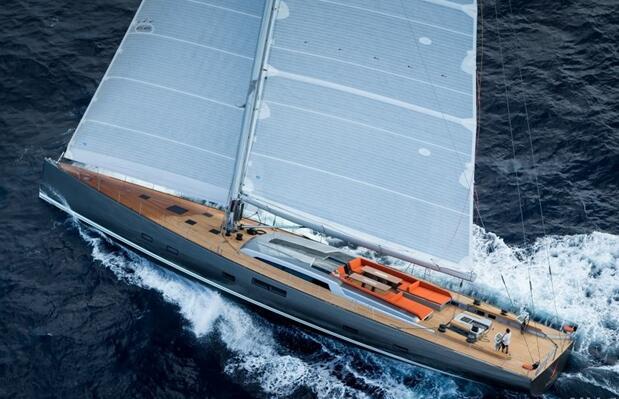 低矮的流线型舱面船室是Nauta Design在高性能竞赛帆船和巡洋舰上的新设计。充满金属光泽的铁灰色船身与柚木甲板上银白色闪亮舱面船室形成色调鲜明的对比,营造出动感时尚的当代风格。橘红色的沙发更是令人眼前一亮。