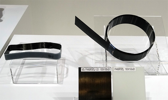 使用的碳纤维带沿同一方向排列碳纤维,用聚酰胺(PA6)固定聚集到一起。此次展出的样品是用两片厚度为0.3mm的碳纤维带夹着厚度为2.4mm的PA6板(按重量比例混入45%的玻璃纤维)制成的。弯曲强度方面,普通的射出成形品为315MPa,而开发品(样品)提高到了553MPa。干燥状态下的弯曲弹性模量从13GPa提高到了51GPa。而且,含有水分时的弯曲弹性模量的下降程度方面,普通射出成型品高达50%,而开发品控制在了20%。