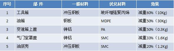 根据各种零部件的特点,我们采用高强钢代替普通钢材、用轻金属代替钢材、用塑料代替有色金属。