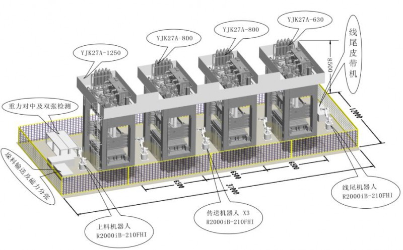 线单元:垛料输送台车及导轨、磁力分层系统、重力对中台、双料检测系统、拆垛上料机器人R2000iB-210F HI (端拾器);传送机器人单元:3台机器人R2000iB-210F HI (端拾器);线尾单元:机器人R2000iB-210F HI (端拾器) 、线尾皮带机、检料台、照明系统;压力机单元:4台(1250T、800T、800T、630T)。
