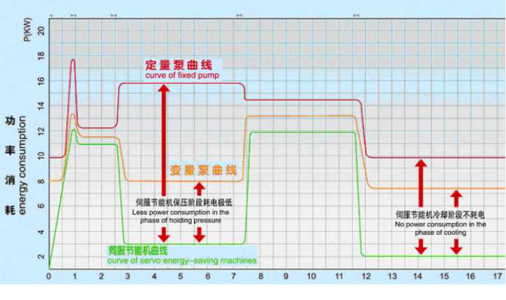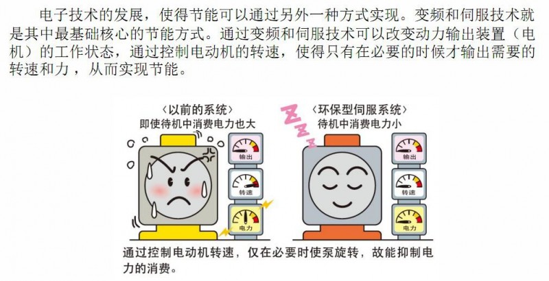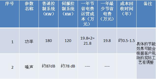 A,普通控制系统,平均功率消耗占总装机功率约31%,折算总计耗电量为56度/小时;B,伺服控制系统,平均功率消耗占总装机功率约13%,每小时耗电23度/小时;C,这样对比普通控制和伺服控制两种控制方式的耗电量,每小时节能33度,节能比58%,一年总计(56-23)×20×300=198000元,电费总计19.8万元,由于采用伺服控制方式还有节约水源,增加液压油和液压元器件的使用寿命,降低噪音等隐性价值,约2万元,总计一年可节约运营成本21.8万元左右;D,根据压机不同的配置要求,约需要半年到一年半的时间收回成本。