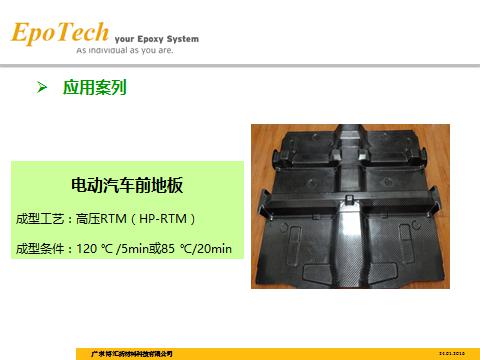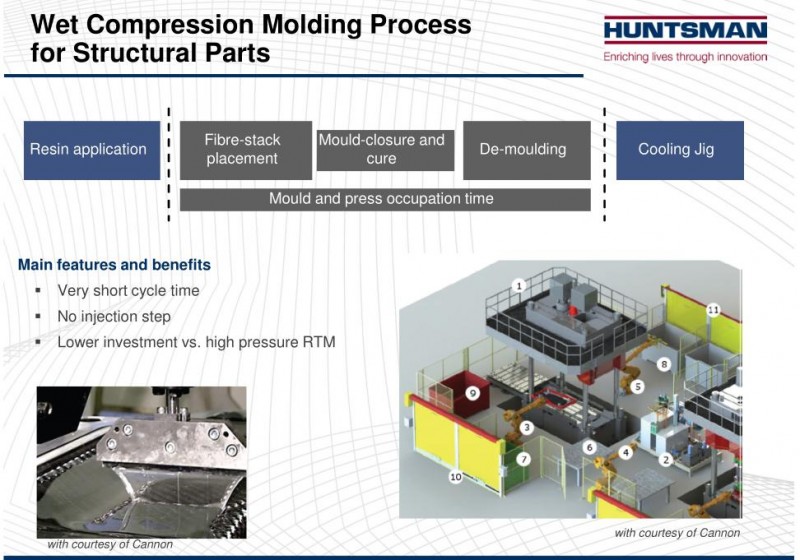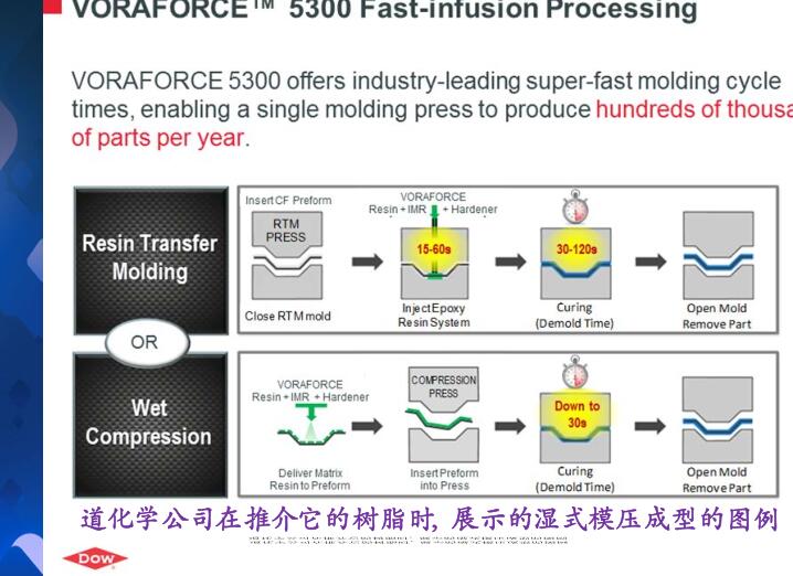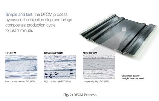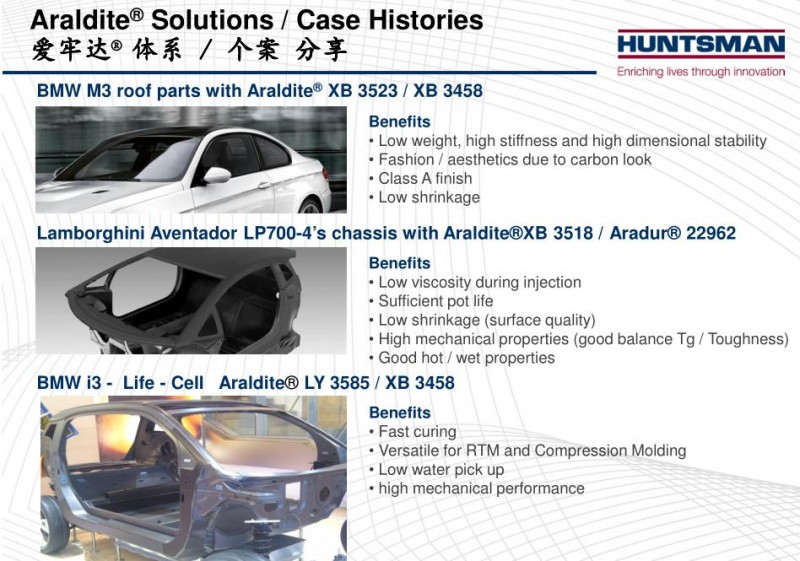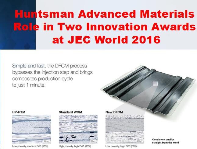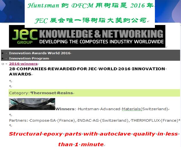 亨斯迈先进材料事业部日前还推出更高效的动态流体模压成型工艺(DFCM),该工艺是先行在汽车部件纤维上涂布一层树脂,从而使其进入纤维层内,此举减少了纤维浸渍的时间,并配合固化进程以达至高效益。能直接借模具提供质量稳定的产品,其采用了能快速固化环氧树脂,其生产部件的特点,是拥有高纤维含量和低空隙率。这是一种经过优化的模压工艺,有着简单快速制作的过程,可在30秒内固化,其生产周期仅为1分钟。我们的创新技术“能以一分钟的时间制造出可与正压釜工艺相比的环氧结构部件”也在JEC World 2016上斩获创新大奖。