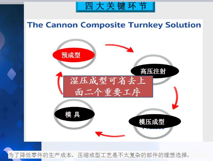 3,WCM工艺基本无须纤维织物的预定型、无须树脂的高压注入、无须担心织物被冲散、成型周期更加缩短等优点,且可直接应用原有的SMC压制模具。