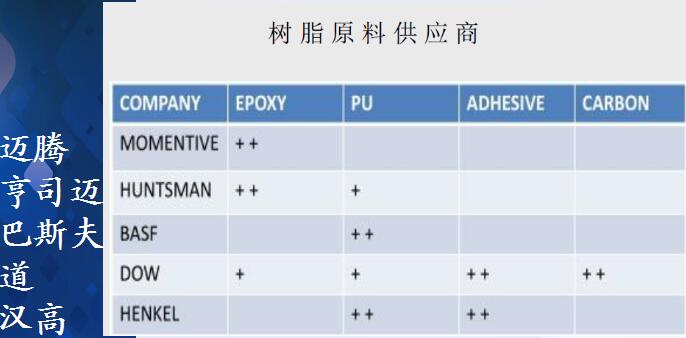 4,WCM的核心技术是基体树脂(EP,PU)必须是似水一般的超低粘度,30~60秒内固化而窗口期又足够长……皆由级大化工掌控,国内企业也开始涉足。