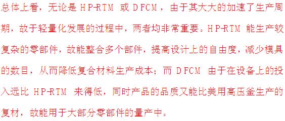 1,传统的RTM和CM(压缩成型)由于要适应汽车大批量快速连续生产的需求,近代发展了HP—RTM和WCM(湿式模压成型)工艺,这还在不断更新中。