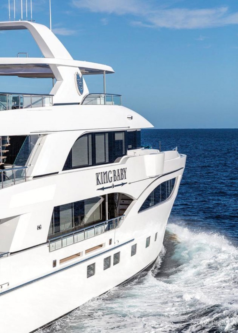 King Baby线条硬朗、极富侵略性的外型特点出自设计师Mitchell Binder和美国珠宝品牌King Baby的合作。甲板开阔、船身纤长,总吨位497吨,是船厂迄今为止交付的尺寸大的一艘混合动力艇。