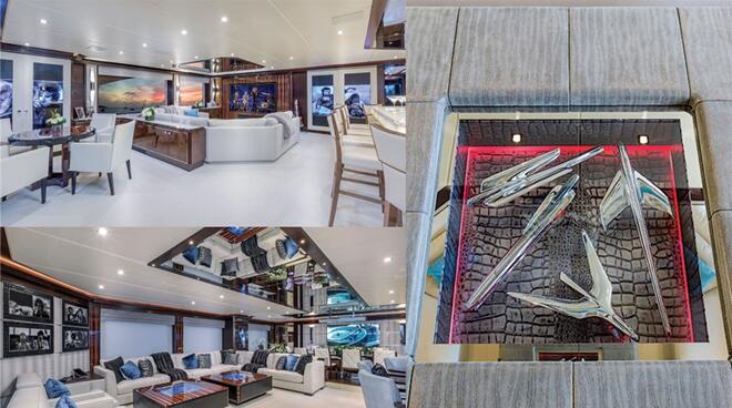 显眼的摇滚风格挂饰、摆件、装修元素遍布游艇各处。“这很有趣,因为客户狂热地喜爱这些玩意。”Binder介绍道。高空休息室的两扇大门上以摇滚明星凯斯•理查德年轻时一张卧躺姿势照片装饰,打开大门,艇上屈一指的影音娱乐系统出现在眼前。