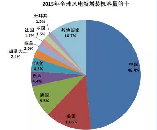 继续引领风电增长,2015年我国新增装机容量达到30.5GW,位列;排在第二的美国风电延续了缓慢复苏的趋势,新增装机容量达到8.59GW;德国以6.01GW新增装机容量位列第三;巴西和印度分别以2.75GW、2.62MW的新增容量位居风电新增容量第四和第五。