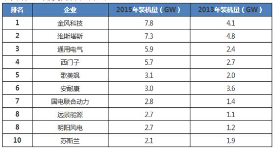 2015年在风电产业回暖的利好驱动下,风电整机企业新增装机容量得到稳定增长,金风科技凭借7.8GW的新增装机,一跃成为当年大风电整机制造商,本土装机占其总装机容量的99%。丹麦的维斯塔斯、美国的GE、德国的西门子和西班牙的歌美飒分列二到五位。