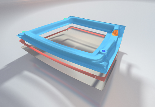 热塑性树脂传递模塑成型工艺(T-RTM)开始于冲压模具内,连续纤维预成型件(玻纤和碳纤,60%的纤维含量)在模具内被己内酰胺浸润。己内酰胺在被注入时,与一种引发剂/催化剂混合,促成聚合发生,己内酰胺转化为PA6。