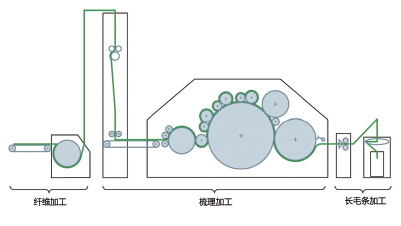 这一流程链从德国格罗瑙的Altex Textil-Recycling GmbH & Co. KG(Altex纺织品回收有限公司)将rC纤维从废弃的纱管上取出开始。由剪切设备(生产商:位于比利时Corbion 的Pierret Industries公司)按照规定的约80mm的长度剪切纤维。然后处理过的rC纤维由德国邓肯多夫的Textile Tech- nology and Process Engineering(纺织技术及加工工程研究院)(ITV)加工(图4)。先,在用德国柏林的Memmingen Textil Engineering公司(原名Maschinenfabrik Memmingen)对纤维进行梳理之前,用法国Cours la Ville 的Laroche公司的设备开松rC粗纱(此处纤维被相互分离成单独的一根根纤维),然后加工成纤维条(图5)。此后,rC纤维条用ITV公司自己开发的设备(图6)纺成rC短纤纱,后卷绕在纱筒上。这些筒子被发运到项目的另一个合作伙伴、Gustav Gerster旗下的Gerster TechTex公司,由其将rC短纤纱生产成无皱褶织物。