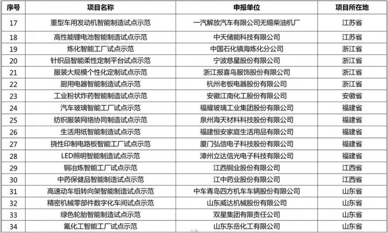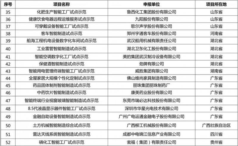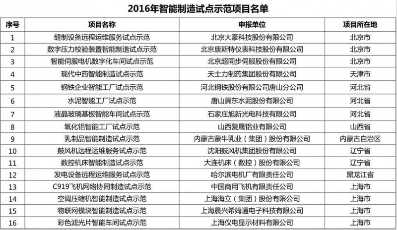 2016年7月4日,经各地方工业和信息化主管部门推荐、专家评审,按照《智能制造试点示范2016专项行动实施方案》和《关于开展2016年智能制造试点示范项目推荐的通知》,工信部公布了2016年智能制造试点示范项目名单定,具体如下: