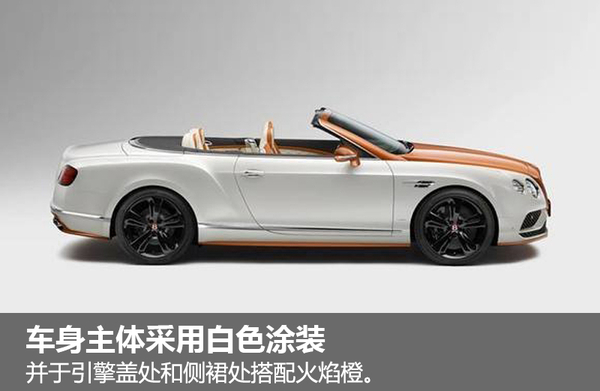 官图显示,宾利欧陆GT V8 S特别版的车身主体采用了白色涂装,并且于引擎盖和侧裙处使用了火焰橙涂装,与黑色轮毂相结合,制造出强烈的视觉冲击力。而新车在内饰方面也采用了相同的色彩搭配,以白色为主,橙色与黑色点缀,从而与外观涂装相呼应。