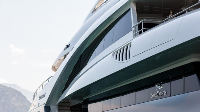 设计师Osman Tanju Kalaycıoğlu的极简主义风格让游艇显得经典而不落俗套,这也是Sarp视为其核心的格调。“这样设计的意图能让她在任何背景和环境中都显得特别而卓越,她的外观充满流线感,比例匀称。”设计师的构想由船厂经理Emre Sandan带领他的团队来实现。