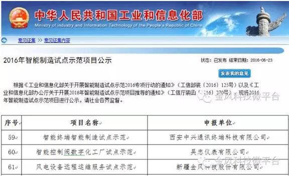 近日,工信部公布了2016年智能制造试点示范项目名单,金风科技提交的《风电设备远程运维服务试点示范项目》成功入选,是国内风电领域项目次入选智能制造试点示范项目。