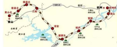 1.项目简况。杭州至黄山铁路(简称“杭黄铁路”)位于皖南及浙西地区,线路东起浙江省杭州市萧山区,向西经杭州市萧山区、富阳市、桐庐县、建德市、淳安县,越皖浙交界的天目山山脉进入安徽省,经宣城市所辖绩溪县和黄山市所辖歙县、徽州区至黄山市。杭黄铁路全线设杭州东等10个车站。线路总长度264.8km。可研批复投资估算总额365.5亿元。杭黄铁路沿线分布有黄山、千岛湖、杭州、富春江等一批着名的旅游资源,杭黄铁路的建设,将极大地促进黄山与上海、杭州的联系,形成“名城—名湖—名山”级黄金旅游线,可以切实加强景区间合作和协调配合,构筑发展合力,资源共享、客源互送,形成旅游产业一体化的新格局,极大的拓展旅游市场,有利于促进沿线旅游产业大发展,进而带动当地经济的整体发展。对带动皖南地区经济发展、促进杭州大都市的形成具有重要意义。