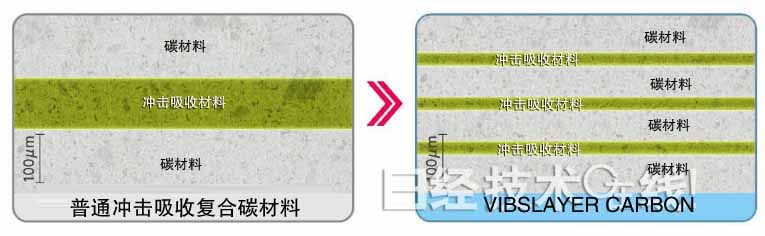 图2:以往冲击吸收复合碳材料(左)和“VIBSLAYER CARBON”(右)的构造示意图