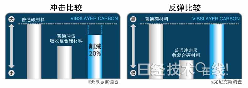 图3:普通碳材料、原来的冲击吸收复合碳材料以及VIBSLAYER CARBON三者的比较(点击放大)