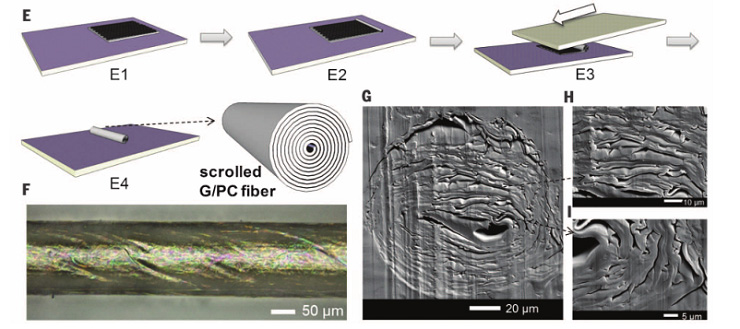 (A)4 J堆积法构造4 J复合材料:(I)自旋PC溶液涂层和蚀刻铜;(II)堆积i层G/ PC薄膜;(III)切割并折叠;(IV)在37Mpa和155℃堆叠和热压(B到D)由i=9(3570 nm /层,V G≈0.009%)平面组成的复合材料的SEM图像,分别取J = 1和J = 2(E)横向剪切滚动纳米复合纤维的方法(E1)铺在Si/SiO2基上的G / PC薄膜。(E2)薄膜的一端由于玻璃毛细管而产生折叠。(E3)薄膜受到两Si/SiO2片的横向剪切力开始滚动。(E4)滚动纤维的横截面为阿基米德螺旋形。(F)纤维2的光学显微镜图像,直径(d)= 160+4μm。(G到I)横截面直径d = 131+3μm的纤维的SEM图像。比例尺分别为 20、 10 和 5 毫米。