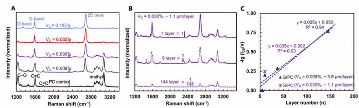 (A)G / PC复合材料的拉曼光谱(1层)和PC矩阵控制。2D峰值强度和G峰值强度的比值(I2D/ IG)= 2.1,表示了单层石墨烯的单层性质。在1350cm?1处的D带说明了cvd石墨烯多晶的性质,共振增强后的石墨烯拉曼截面是PC的18000倍大(fig. S4A)(B)G / PC复合材料在i分别取1、9、144时的拉曼光谱(V G≈0.030%);光谱强度进行归一化处理。(C)G / PC 复合材料在V G≈0.009和0.030%时的-lg(I2D / n)除以n的图形。
