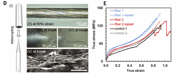 (A)2个40层复合材料平面分别在VG≈0.185、VG≈0.082%和PC矩阵控制(应变振幅= 0.34%;频率为1 Hz)条件下,储能模量(E′)和损耗模量(E′′)随温度变化的曲线。(B)纤维1(VG≈0.185%、control-1)和纤维2(V G≈0.082%、control-2)在类似的涡旋结构下E′和E′′随温度的变化曲线。(C)对于PC矩阵,弹性模量的变化增量(DE和DE′)△E除以VG(平面复合材料和不同G/PC复合材料中的滚动纤维报道数据)得到的曲线。虚线由Mori-Tanaka理论预测。(D)理想的伸缩机构。(I)实际上,变形发生在大部分纤维的内部,而不是靠近纤维的末端;滚动纤维2在拉伸时的光学图像,在应变为60%时d = 120±2μm(II)、断裂(III和IV);滚动纤维(control-1)和断裂时(V)的扫描电子显微镜图像,表现失败时层的分离。(E)具有相似涡旋结构的两种复合纤维及其PC控制纤维的真应力-应变响应曲线图。