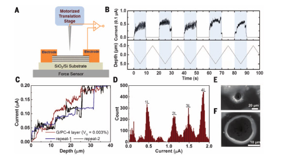 (A)用于同时检测G / PC复合材料、(安装在电动平移台系统的)钨探针的电学性能的显微系统,该探针的柄直径为80mm,轴尖端直径直径为100nm。随着导电探针逐层的接触石墨烯,探针通过每层时导电分别增加。(B)由于探针和G/PC表面周期性的接触和脱离,电流也形成相应周期。微探针的速度保持在1mm/s(下)和–1mm/s(上)交替,在10砂电压=1.0mV的时间跨度。淡蓝色的区域表示探针和复合表面之间的接触时间。(C)在探针运动过程中(1mm/s,1mV),电流随深度的变化曲线。和三个类似的G/ PC复合材料样品的穿透过程曲线(V G≈0.003%、四层)。(D)测得的电流信号值分布(计数)的直方图分布(c中红色)。(E和F)典型的电子探针穿孔复合膜形成断裂部位的扫描电镜图像;比例尺分别为20毫米和10毫米。