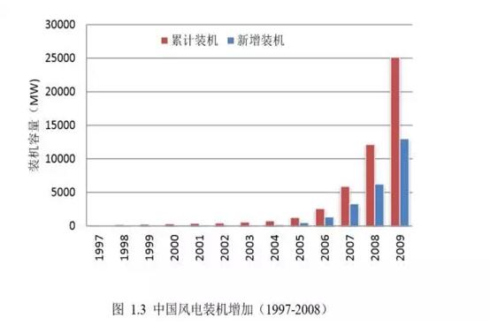 自 1986 年建设山东荣成个示范风电场至今,经过近 25 年的努力,的风电场装机规模 不断扩大。自 2005 年 2 月《可再生能源法》颁布之后,风电开始迅猛发展,特别是“十五”和“十 一五”期间,风电发展提速,总装机容量从 2005 年的 126 万 kW 增长到 2008 年底的 1217 万 kW,年增长率超过 100%(能源网,2009)。据初步计算,2009 年风电仍然保持快速发展 状态,年内新增装机超过 13GW,连续 4 年实现增速 100%(图 1.3)。