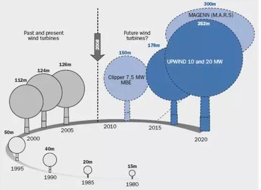 风机规模——在过去 20 年中,风机单机的规模基本呈现线性增长趋势,目前已达到 5~6MW(见 图 1.4),风机转子直径达到 126 米,风电技术快速发展(IEA,2008)。通过改进叶片材料(利用环氧树脂基和玻璃纤维来减轻风机重量,同时提高负荷强度)、采用低速直趋发电机(在大规模风机中 采用直趋技术是指在低速发电机中应用单阶驱动技术,从而降低发电机的直径尺寸;另外分布式驱 动系统也可有效降低重量和尺寸)、对驱动和转子负荷实施反馈控制等技术,未来风机的规模仍有上 升的空间(R. Thresher, A. Laxson, 2006)。但是值得注意的是交通工具对大型风机运输安装的限 制将随着风机规模的增大而愈加突出。