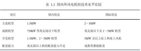 1996 年以来,我国新增风电机组的单机容量基本上以 750~850kW 为主,从 2007 年开始,新 增风电机组转为以兆瓦级为主。目前,国产风电机组单机容量已达到 1.5MW、2MW 甚至更高(蒋 丽萍,2008)。代表技术发展方向的兆瓦级直驱式变速恒频风电机组和兆瓦级双馈式变速恒频风电机 组已实现批量生产,其轴承、变流器及控制系统等核心技术仍然依靠国外厂家。
