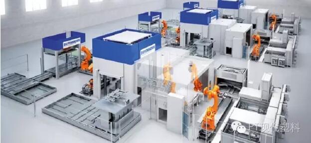 所应用的树脂依据重量而得到记录。该制程确保了生产的再现性并终有助于提高部件质量。树脂料仓装有一个通风系统,在这种开放式的加工步骤中,烟雾的排放量可以达到5000m?/h。在施加树脂后,穿梭台移动到送料位置,叠层材料由机器人放入压机中。压机闭合后,叠层材料在大约150℃的模具温度下得到压制和固化。然后压机打开,一台取件机器人将部件放入一台冷却压机中。在后的加工步骤中,一台机器人将冷却好的碳纤维部件从冷却压机中取出,然后将其放到卸料输送机上。
