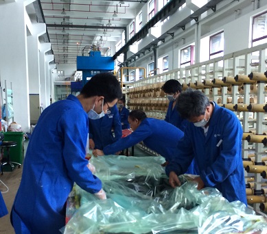 在工程中心的现场,桌上是一卷卷排布整齐的制件原材料,十几个模具依次排开,几十几名团队成员各就其位,裁布、清理模具、铺布、密封、配胶、注胶、固化、脱模、切割、打孔、打磨、检测等十多道工序有条不紊的进行着。