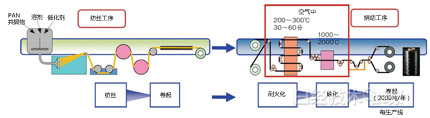 将PAN纺成丝后实施耐火处理,即空气中加热至200~300℃使之氧化,赋予其耐热性。该工序耗时30~60分钟。