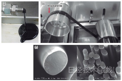 (a)利用用于服装的低价格PAN制造的前驱体聚合物。(b)在纺成丝的PAN中添加溶解促进剂和氧化剂,在液体中实施氧化处理。(c)用新工艺制造的碳纤维。