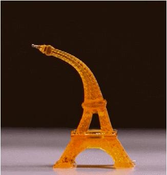 以下是该4D打印技术展示的样品,这个小型的埃菲尔铁塔在常温下是弯曲的,但是在稍微受热之后,几秒钟之内就恢复到了原来的形状。
