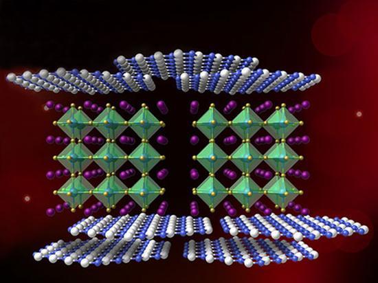 氮化硼纳米片(蓝色和白色原子)充当绝缘体,能够在高温能量存储中保护处于中层的硝酸钡(绿色和紫色原子)