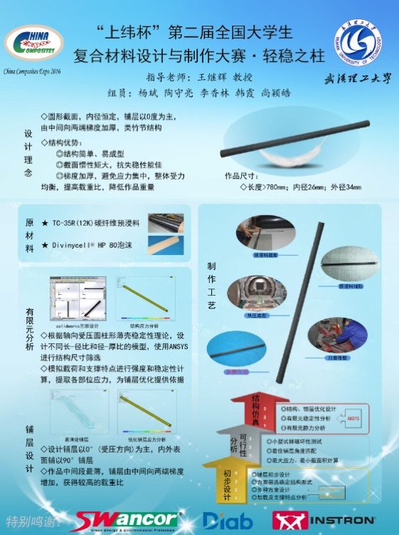 武汉理工大学的参赛作品更注重设计与工艺的平衡,作品选择简单的圆心截面构型,通过有限元软件优化铺层设计,立柱整体以0°纤维为主,两端梯度加强,使整体受力均匀。