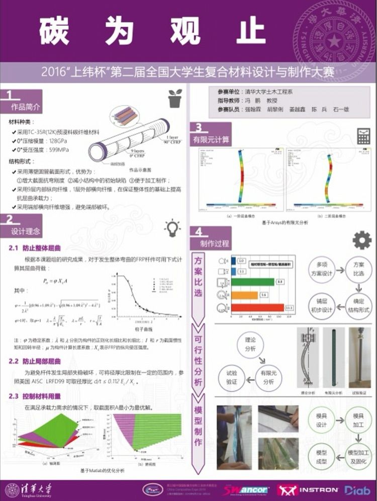 清华大学一队的海报简明清晰的呈现了碳纤维复合材料制品从设计、制作、评估的完整创新开发过程。他们的理论基础扎实、选题理解透彻、海报清晰完整,令人“碳”为观止!
