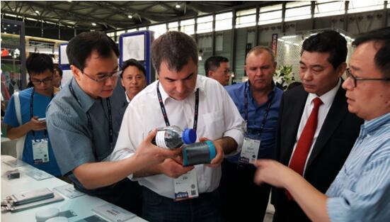 今年6月,诺奖得主、石墨烯发明人之一、英国曼彻斯特大学教授康斯坦丁·诺沃肖洛夫在上海举行的移动大会展台了解碳谷集团的石墨烯产品,右二为戴加龙。