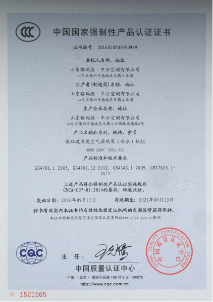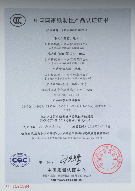 山东格瑞德集团低环境温度空气源热泵(冷水)机组荣获CCC认证证书