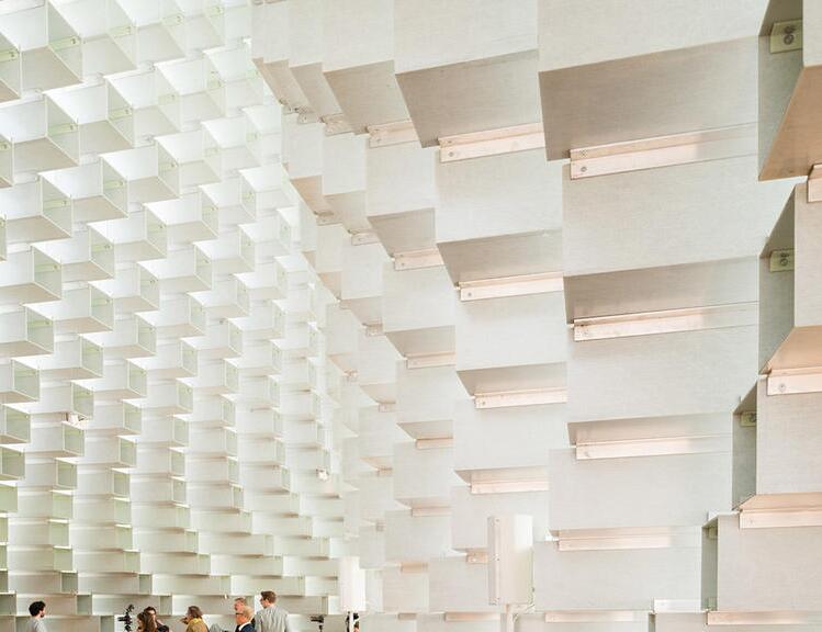 Fiberline 为其特制了 1900 块空心砖。用在底部的比较厚实,有 10 毫米厚,中部的是 6 毫米,而顶部的只有 3 毫米。这些空心砖用简易的金属连接件组合在一起,就形成了这个具有几何美感的外观。