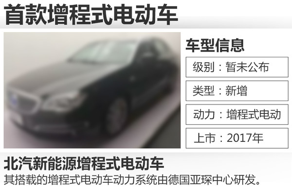 北汽新能源目前产品以纯电动车为主,旗下款增程式电动车将于2017年正式上市。增程式电动车是在纯电动汽车基础上,装备一个小型的辅助发电机组以备电池电量不足时为电池充电,这个小型辅助发电机组被称为“增程器”。