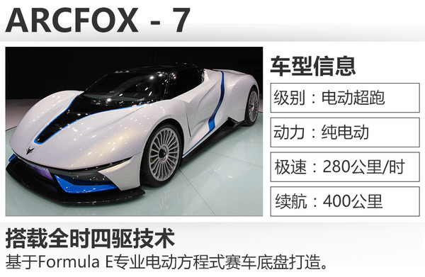 除该款增程式电动车外,ARCFOX-7量产版也将于2017年正式上市。其基于Formula E专业电动方程式赛车底盘打造,车身和底盘均采用轻量化碳纤维材质,并搭载全时四轮驱动技术,0-100公里/时加速时间不超过3秒,极速可达280公里/时,续航里程超过400公里。